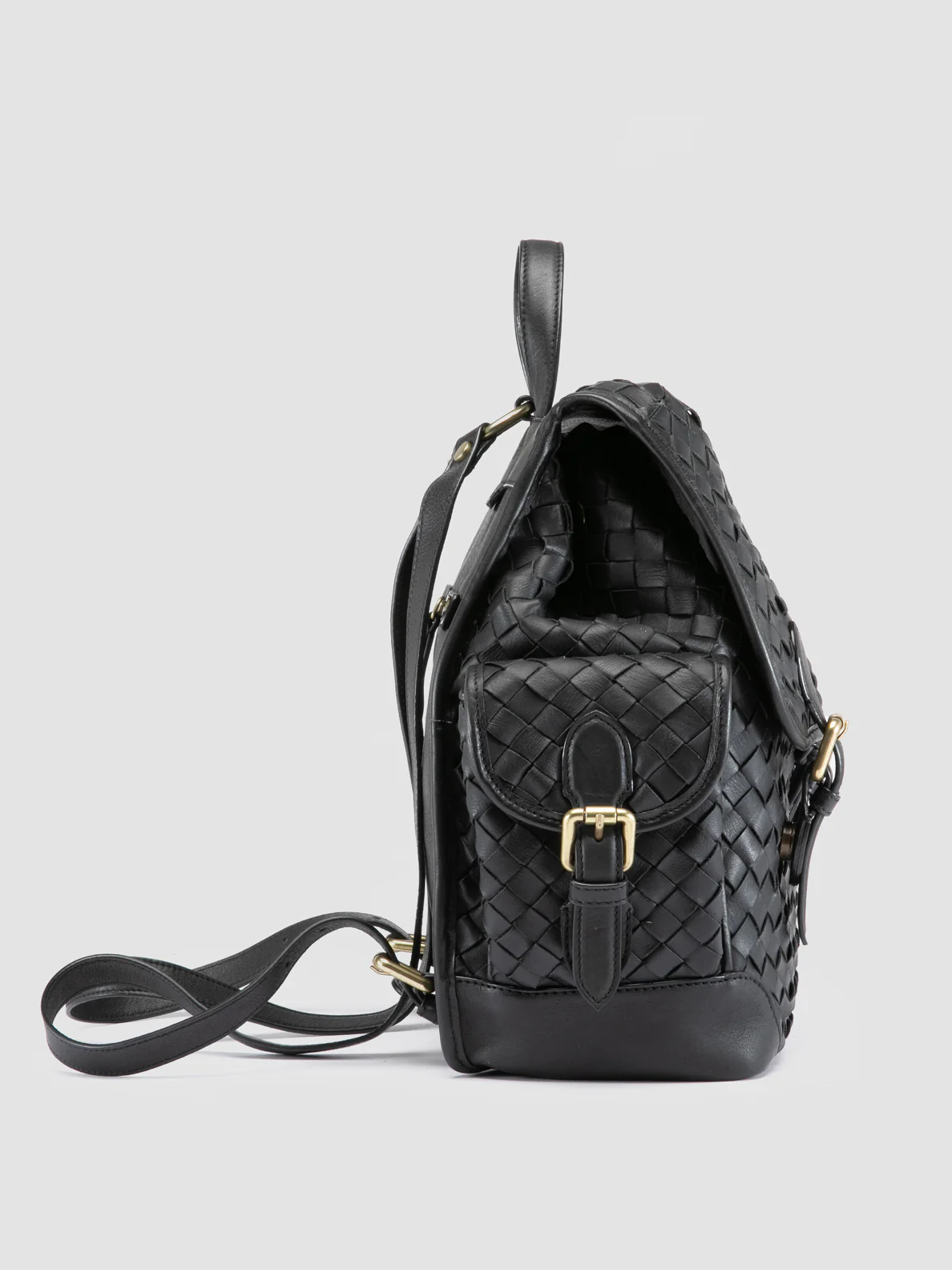 The Aura 004 backpack is crafted from handwoven black leather, featuring a flap with buckles to secure the main compartment, plus side pockets and a back zip for convenience. Adjustable straps and antique brass hardware finish the design. CODE: AURA/004 BREED NERO