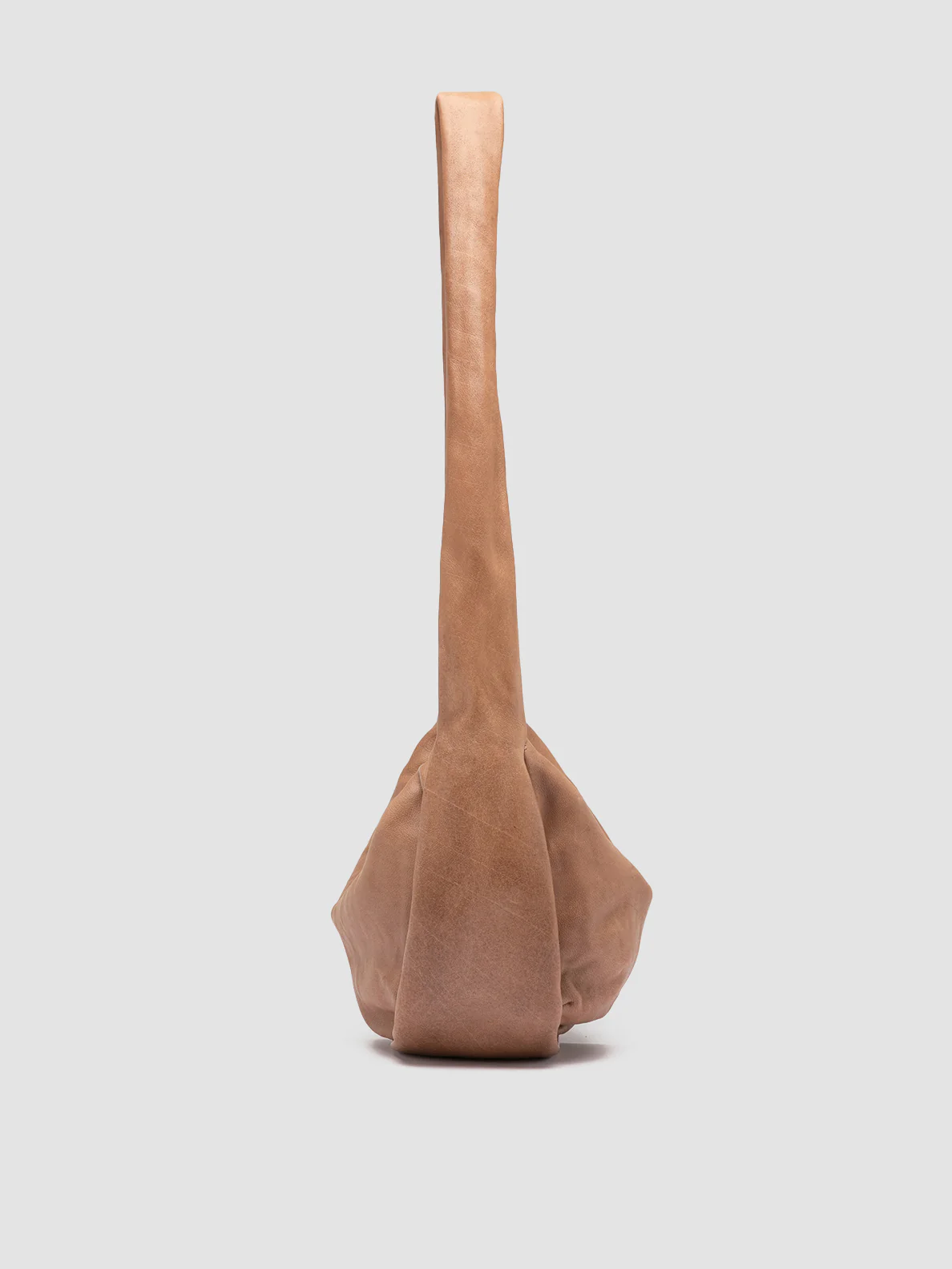 The Bolina 046 crossbody bag in earthy brown leather presents a relaxed silhouette with a draped shoulder strap. The design emphasises minimalism and functionality, offering a spacious interior with a double-zip closure. CODE: BOLINA/046 IGNIS T. FANGO