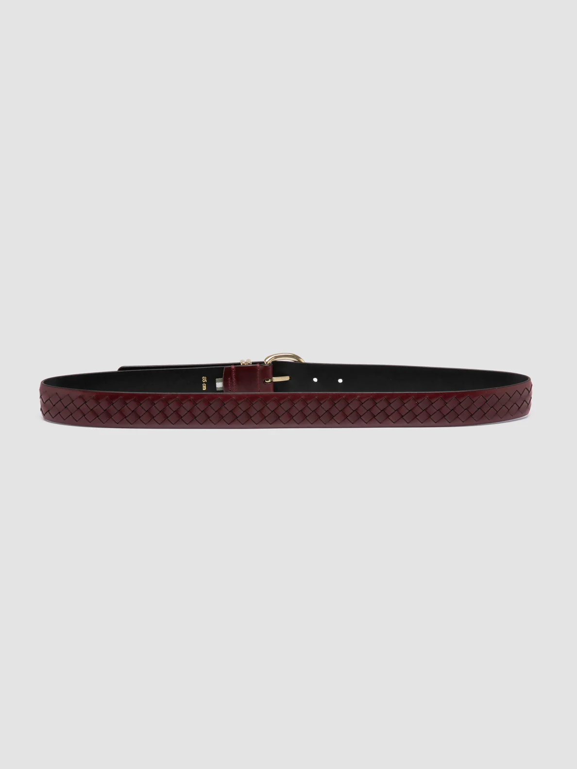 Handwoven from premium burgundy leather, the OC Strip 46 belt showcases impeccable artisanal craftsmanship. The rounded gold-tone buckle and dual loops add an elegant contrast, making it a sophisticated yet versatile accessory. CODE: OC STRIP/46 PARMA INTRECCIO BORDO'
